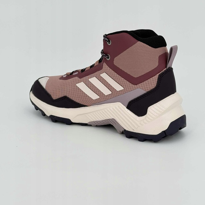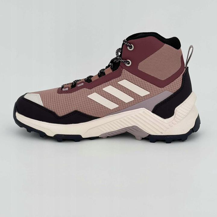 Adidas Terrex Eastrail 2 Mid R.RDY to wytrzymałe, średnio wysokie buty trekkingowe stworzone do wędrówek w zmiennych warunkach pogodowych. Model wyposażono w wodoodporną technologię RAIN.RDY, która skutecznie chroni przed deszczem i wilgocią, jednocześnie zachowując oddychalność. Cholewka wykonana z trwałej siateczki i syntetycznych wzmocnień zapewnia stabilność oraz odporność na otarcia, a podwyższona konstrukcja wspiera kostkę na trudniejszych odcinkach szlaku. Stylowa, stonowana kolorystyka z bordowym i pudrowym różem nadaje im nowoczesny, outdoorowy charakter. Mocna podeszwa z agresywnym bieżnikiem Traxion gwarantuje pewną przyczepność na mokrej, błotnistej i kamienistej nawierzchni.