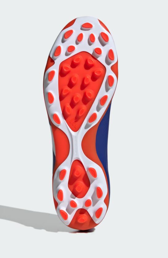Adidas Predator League 2G/3G AG to korki zaprojektowane specjalnie z myślą o grze na sztucznej nawierzchni. Łączą dynamiczny, agresywny wygląd z wysoką funkcjonalnością – zapewniają precyzję, stabilność i świetną przyczepność na boiskach 2G oraz 3G. Syntetyczna cholewka w intensywnych kolorach (granat, biel i pomarańcz) doskonale oplata stopę, oferując pewne czucie piłki i ułatwiając kontrolę podczas podań i strzałów. Podeszwa została wyposażona w liczne, krótsze kołki, które gwarantują optymalną trakcję i szybkie zmiany kierunku na sztucznej trawie.